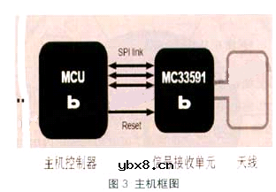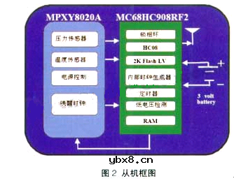 在现有的汽车车胎压力检测装置中,每个轮胎安装一个从机,从机包括信号发射器、压力传感器、控制单元和电池,从机的框图见图2。在汽车驾驶室内放置一个主机,主机中包括信号接收器、控制单元、显示装置、按键等。主机的电源由汽车自身的蓄电池供给。从机每隔一段时间自动检测轮胎的压力和温度并向外发送。主机接收从机发送的数据,判断压力是否正常,如果正常则显示各个轮胎当前的压力;如果压力不在正常范围内,主机则提示轮胎压力不正常并显示当前轮胎的压力。主机框图见图3。