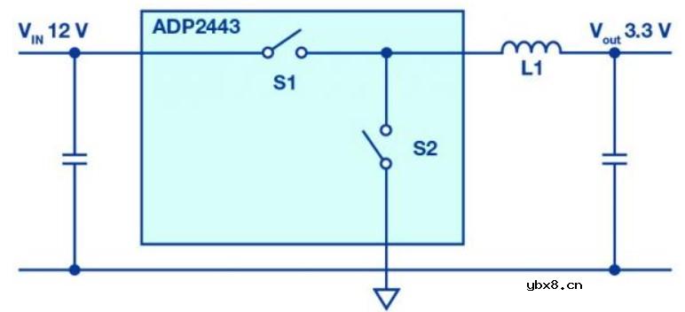 在负载点(POL)降压转换器领域,同步变化的高边和低边有源开关已被广泛使用。图1显示了具有理想开关的此类电路。与使用无源肖特基二极管作为低边开关的架构相比,此类开关稳压器具有多项优势。主要优势是电压转换效