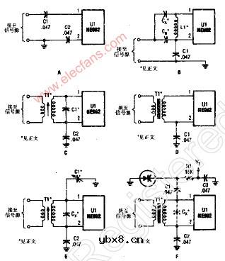 NE602射频输入电路 这里列举了NE602的多种RF输入电路中的几个,对任何调谐或宽带电路都有效。