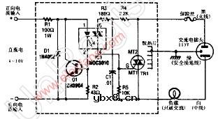 固态继电器电路 R1限制输入电流,Q1起到保护IC1的作用,D1为极性保护器,IC1提供一个三端双向可控硅开关元件的输出去触发主三端双向可控硅开关元件TR1.