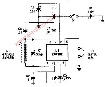 简易1.5V调幅广播接收机 该接收机采用通用电气公司(CEC)生产的ZN416E。通过C1实现调谐。