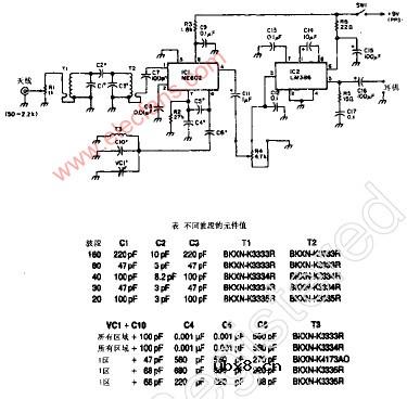 NE602直接转换接收机 SE602作为一个具有中频输出的混频器,U2是一个音频放大器,接收机主要用于SSB和CW信号的接收,T1和T2是10.7KHz的中频线圈,用于AM/FM晶体管收音机,或任何类型的指示器中。