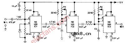 延迟脉冲发生器 在这个电路中采用的三个555IC定时器构成一个简单的延使脉冲发生器,IC1充当波形整形器以产生一个矩形波,IC2产生一个延迟脉冲,在延迟脉冲的下降沿触发IC3,R1控制延迟时间,R1控制延迟时间,R2控制