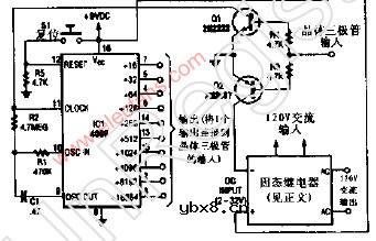 延时继电器 一个长时间使用的定时器可非常监视地采用一个4060CMOS二进制除法器和一个内置时钟振荡器组成,这个固态继电器可根据你的要求定尺寸,如果电源适合的话,也可用一个机械继电器代替,采用图示元件电路