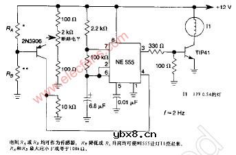 由传感器激活的继电器脉冲发生器 一个传感器接通Q1以激活低频555Z振荡器,振荡器再给灯I1加以脉冲,传感器对光线或温度的改变较为敏感。
