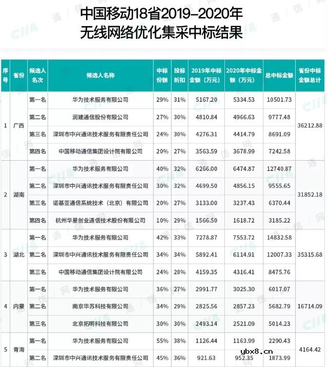 中国移动正式公布了18省无线网优集采项目中标候选人