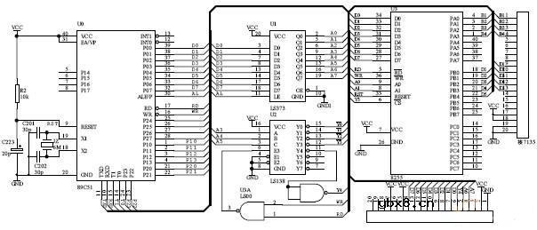 最小系统(电源供电电路与I/O 扩展及选通电路) 本设计使用的最小系统板是以80C52 单片机为内核,并且具有良好的扩展性。CPU 外接11.0592MHz 的晶振,主要由74LS373 锁存电路、74LS138 译码电路以及按键、显示