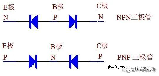 三极管种类大致分2种,一种NPN型三极管,另外一种为PNP三极管。三极管由2个PN结组成。因此,我们可以将三极管看作由2个二极管组成。通过下图可以知道,三极管的公共端为B极(基极)。