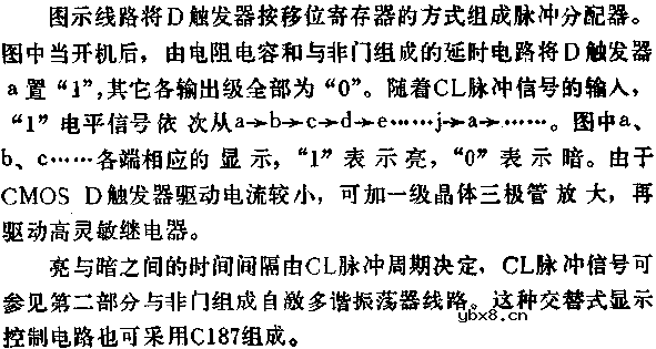 交替显示就是将静态显示变为动态显示,图中所示是用CMOS电路D触发器组成的交替显示的控制电路。