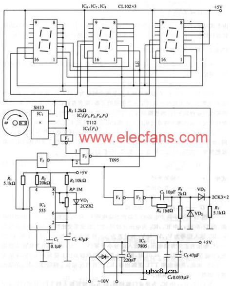 脉冲计数式数字转速仪电路 图17-6-2中由555集成电路IC2及外围元件组成一个多谐振荡器,IC2的3脚输出一系列方波脉冲信号,作为时基信号。采用三个CL102模块组成计数器和显示器。CL102模块是由计数器,锁存器,译码驱