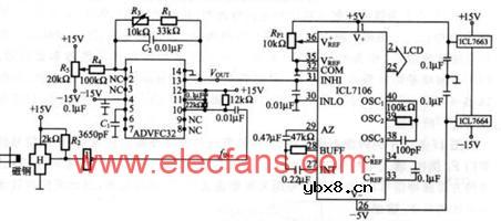 AD转换式数字转速仪的电路 当磁钢与霍尔传感器重合时,霍尔传感器输出低电平,信号经非门整形后,形成脉冲,然后经ADVFC32把频率转换成模拟电压输出,再送入ICL7106进行转换和驱动LCD。