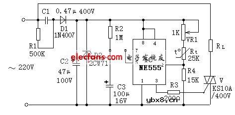 本电路中各点电压都来自同一直流电源,所以不需要性能很好的稳压电源,用电容降压法便能可靠地工作。电路元件价格低、体积小、便于在业余条件下自制。本电路是采用555 时基集成电路和很少的外围元件组成的一个温度