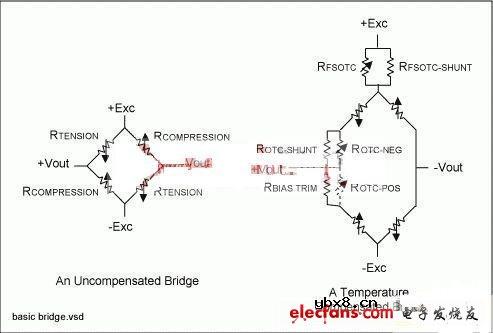 电桥激励 应变片、薄膜和厚膜应变片传感器一般采用惠斯通电桥。惠斯通电桥将应变片应变产生的电阻转换为差分电压(图1)。+Exc和-Exc终端加上激励电压后,+VOUT和-VOUT终端上出现与应变成正比的差分电压。