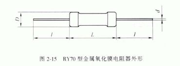 RY70 型金属氧化膜电阻器具有阻值低、过负荷能力强、稳定性强等特点,属高可靠\"七专\"产品。电阻器的外形如图2-15 所示,其主要参数见表2-40。