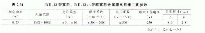 1. RⅡ-12 型高阻、RⅡ-13 小型超高阻金属膜电阻器RⅡ-12 型高阻、RⅡ-13 小型超高阻金属膜电阻器主要参数见表2-31 。