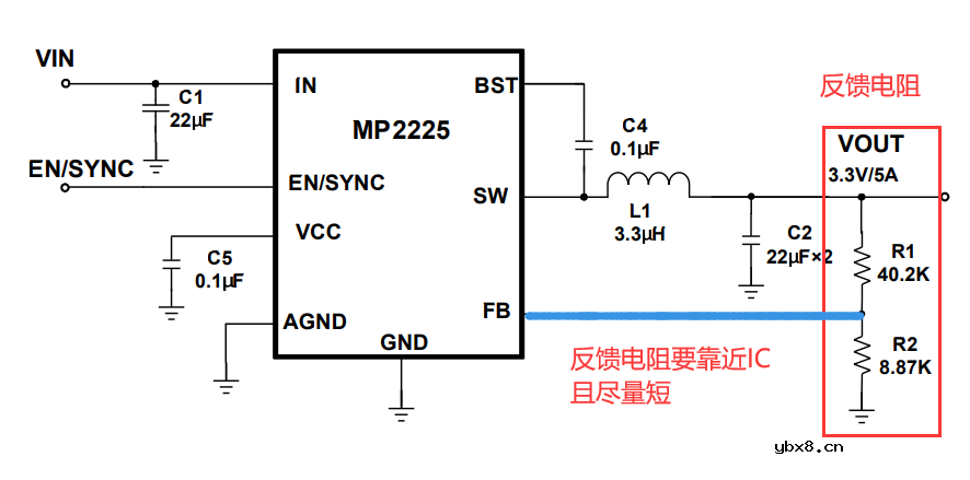 串联分压DC-DC的反馈电阻,串联分压后给芯片内部的误差放大器做运算,控制输出电压的大小,以达到稳定输出的目的。 反馈电阻在Layout的时候需靠近芯片放置 (尽量让蓝色线最短,以保证最小的寄生参数), 电压采样走