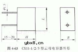 CY11型矩形云母电容器 CY11型矩形云母电容器有四种型号,除CY11-0 型为轴向引线外,其余三个型号为单向引线形式,引线之间的尺寸有46mm ± 0.2mm和36mm ± 0.2mm 两种CY11型矩形云母电容器广泛应用于无线电接收、发送
