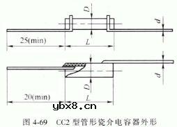 CC2型管形瓷介电容器 CC2 型管形瓷介电容器体积小、容量大,具有多种温度系列组别,对内电极有屏蔽作用,适用于要求低损耗和电容量稳定的交流或脉冲电路中或作温度补偿用。其外形如图4-69 所示.主要特性参数见表4-10
