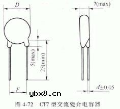 CT7型交流安全瓷介电容器 CT7型交流瓷介电容器充分考虑安全性能,具有体积小、损耗低、安全可靠等特点.适用于彩色电视机、复印机、工业电源以及音像设备等。其外形如图4-72 所示.主要特性参数见表4-112。