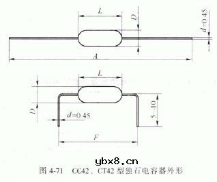 CC42、CT42型独石(积层)电容器 CC42型独石电容器为1类瓷介( NPO) 电容器,适用于高频电路; CT42 型独石电容器为2类瓷介( X7R 、Y5V) 电容器,适用于低频电路。它们的外形如图4-71 所示,主要特性参数见表4-111 。