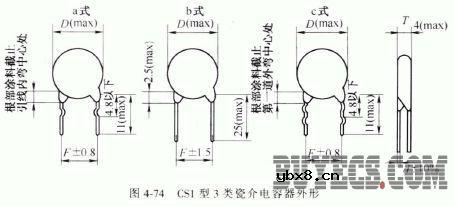 CS1型3类瓷介电容器 CS1型3 类资介电容器具有体积小、电容量大、截止频率高、温度特性优良等特点,适用于对损耗角正切、绝缘电阻要求不高的电路中。其外形如图4-74 所示,主要特性参数见表4-114 。