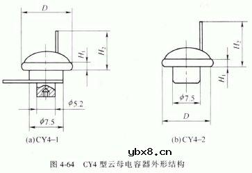 CY4型云母电容器 CY4 型云母电容器为钮扣式电容器,它共有六种结构形式,如图4-64 所示。CY4 型云母电容器具有电性能稳定、损耗小、温度系数小、频率特性和电容量稳定性好等特点,适用于高频和超高频的振荡耦合旁路电