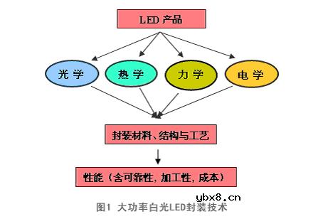 大功率LED封装技术原理介绍 大功率LED封装由于结构和工艺复杂,并直接影响到LED的使用性能和寿命,一直是近年来的研究热点,特别是大功率白光LED封装更是研究热点中的热点。LED封装的功能主要包括:1.机械保护,以
