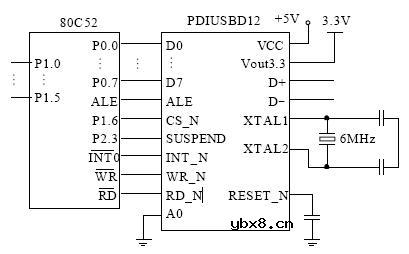 PDIUSBD12与AT80C52单片机的接口电路图 据总线方式、单地址/ 数据总线方式。我们采用的是前一种方式:使用了80C52 的INT0、ALE、WR、RD和P0 口,当PDIUSBD12 接收到主机的有效信息时,会产生一个中断通知80C52 进行