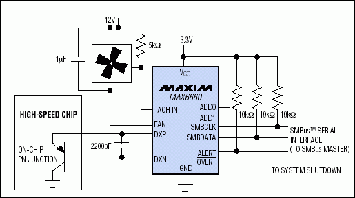 MAX6660应用电路图 这种IC的例子有两个,一个是直流驱动,另一个是PWM驱动,如图1和2所示。图1中的IC远程检测温度并根据温度控制风扇速度。该芯片通过一个内部功率晶体管产生一个直流电源电压。图2中的IC具有类似功